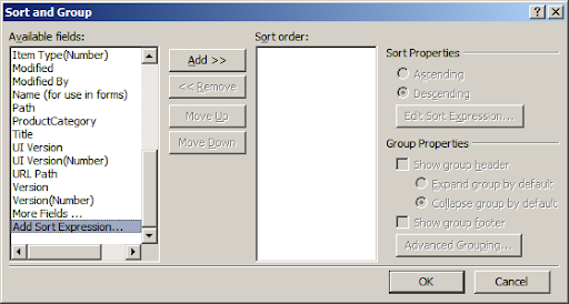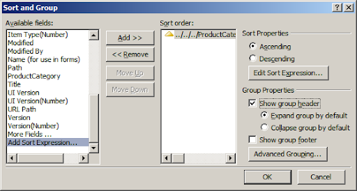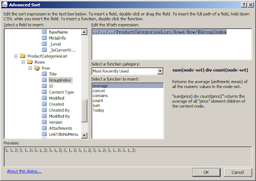 So what does really happen when we change the custom sort expression? If you are curious enough to look inside the generated XSLT, you will see that our modified line ../../../ProductCategoriesList/Rows/Row[@Title=current()/@ProductCategory]/@GroupIndex is used, among other places, as an argument to the <xsl:sort/> when iterating through $Rows. In plain English, the sort expression above would translate to: "For each of the Rows to be displayed (which are Products), order and group them by the value of the GroupIndex attribute for the Row inside the ProductCategories list that has the Title equal to the current Product's ProductCategory." ; Note that the current() XSL function is needed because the <xsl:sort/> call is placed inside a <xsl:foreach/> element.